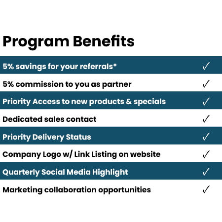 Enjoy 5% savings for your referrals, 5% commission, and priority access to new products and specials. Gain a dedicated sales contact, priority delivery status, and a featured logo with a website link. Plus, benefit from quarterly social media highlights and exciting marketing collaboration opportunities to grow your brand.