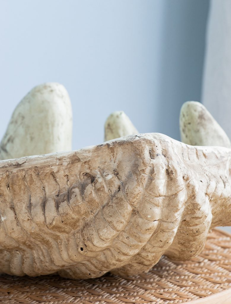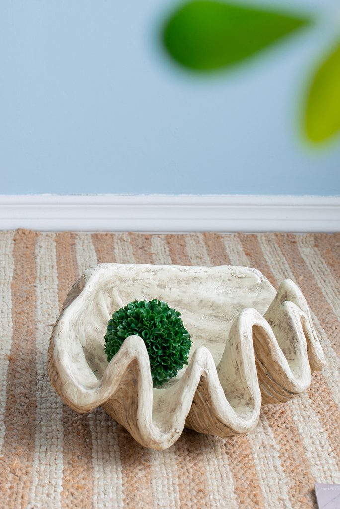 The dramatic medium-sized Clam Shell Accent combines natural shell coloring, rich texture, and a glossy interior for a stunning reminder of the ocean. Featuring surprising versatility, this clam shell makes a bold centerpiece filled with decorative items such as textured balls, faux florals, or even candles. Use in a lavish dining room tablescape, grand foyer, or in a crisp master bathroom.