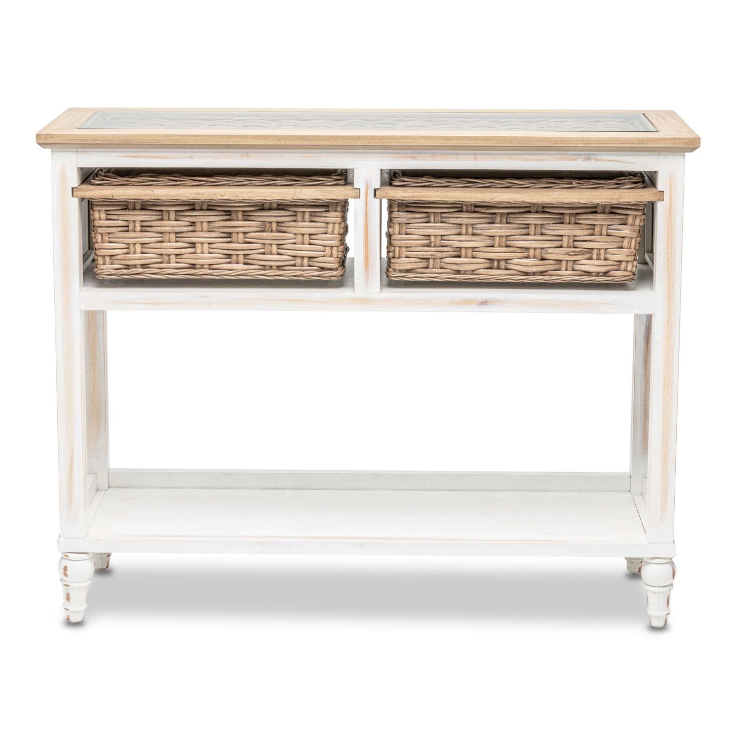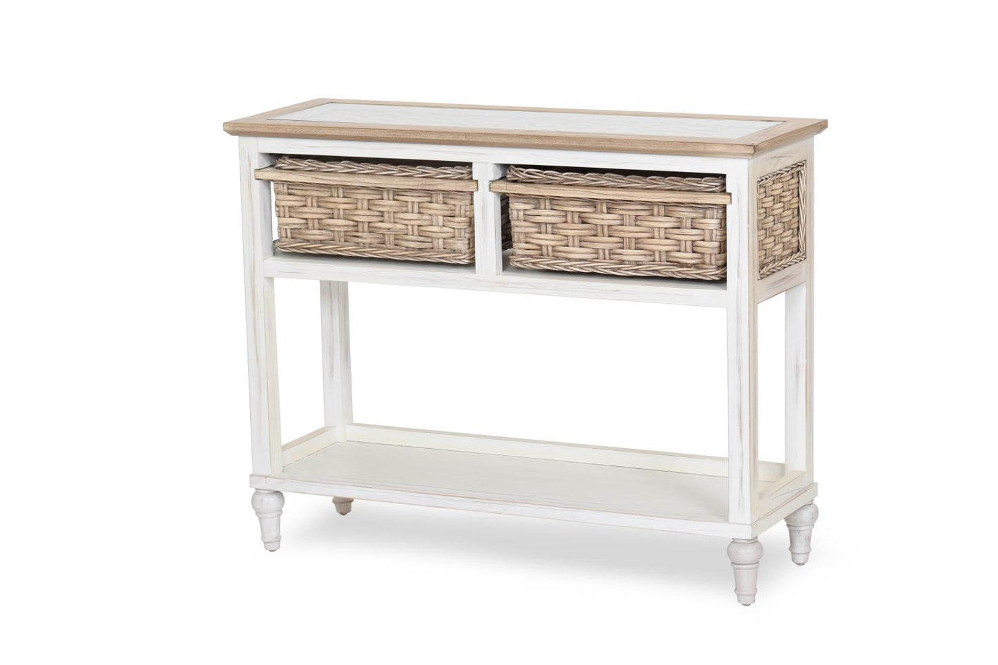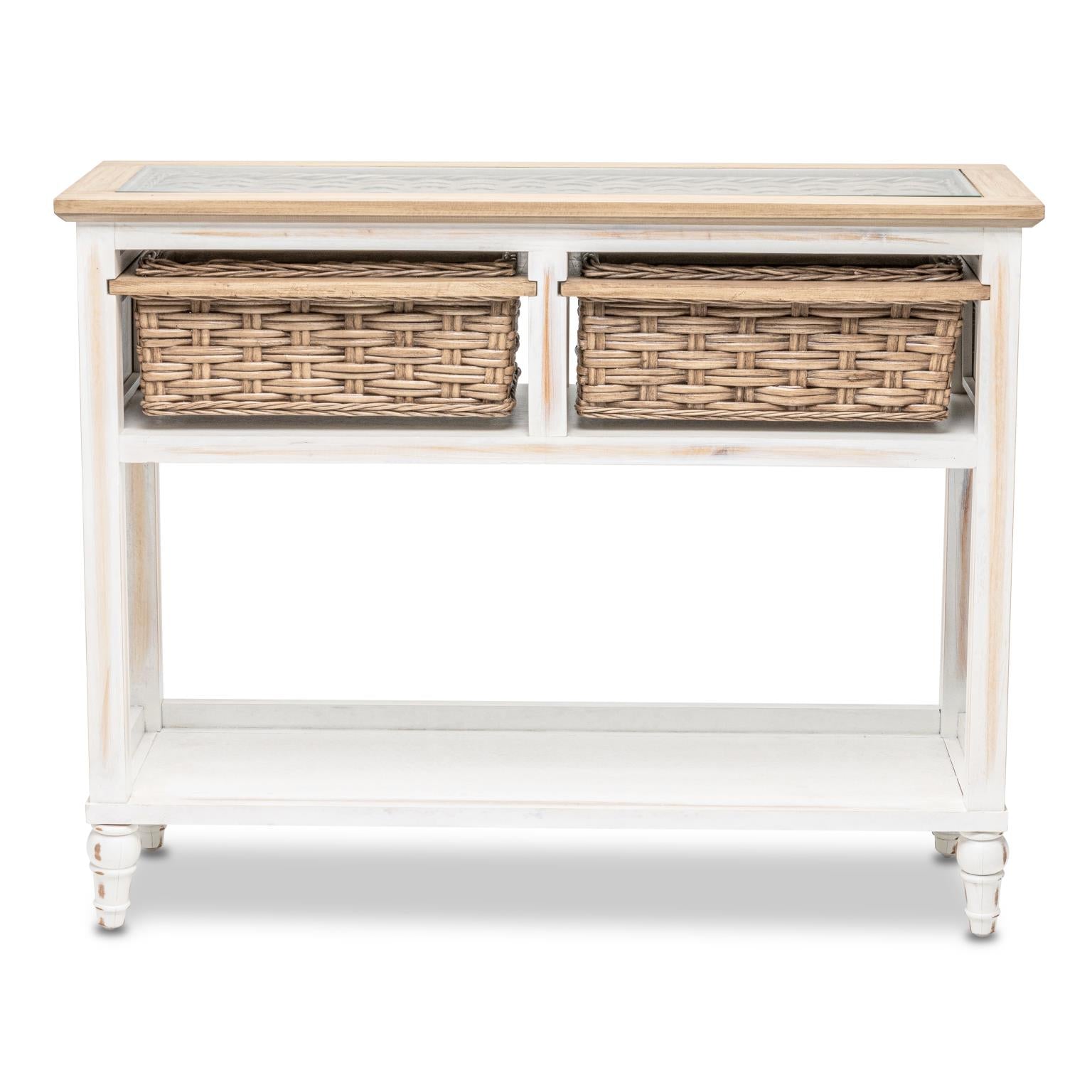 Island Breeze Console Table (2 Basket) Weathered Wood/White Finish