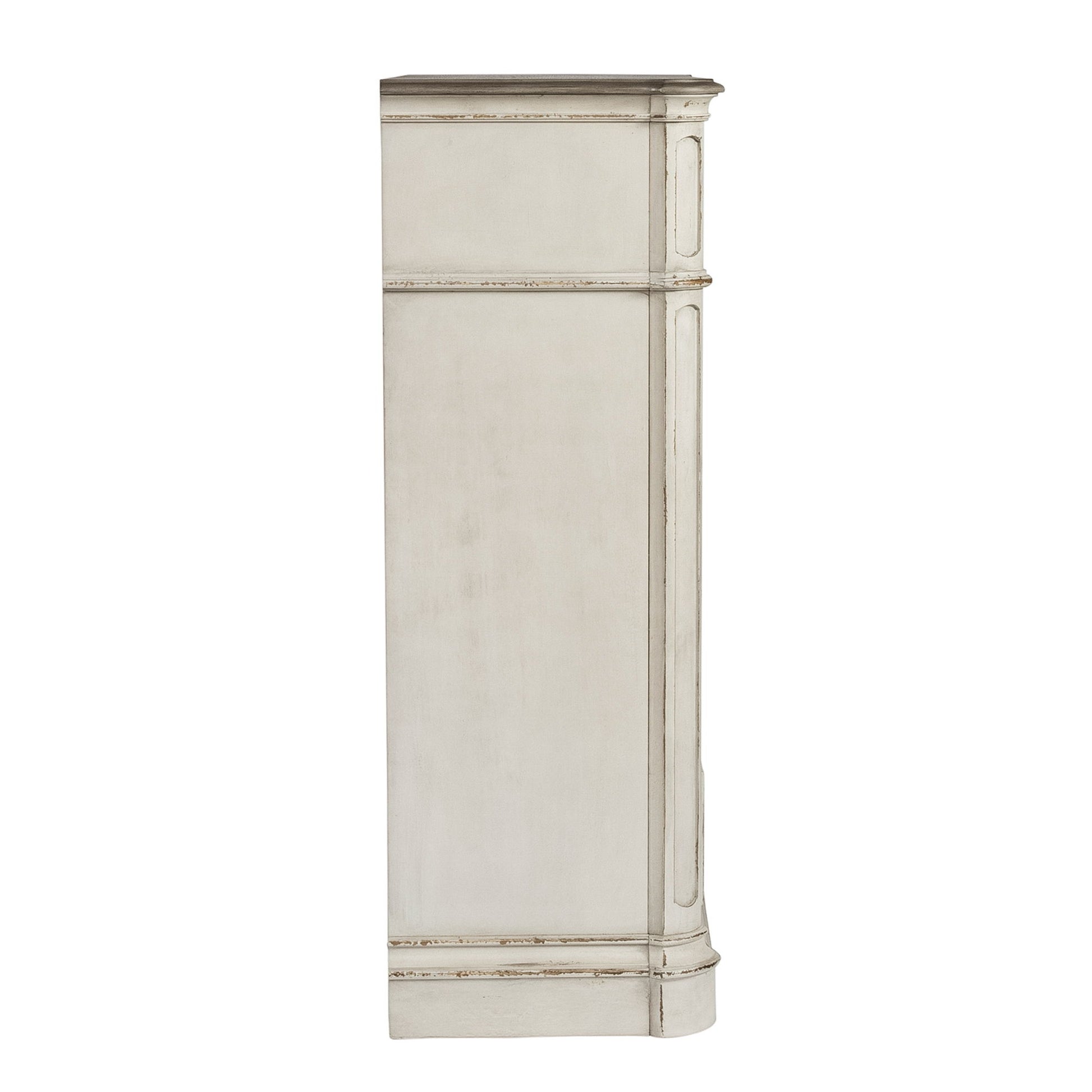Blending of European traditional design influences makes Magnolia Manor a truly unique style for any living space. Warm antique finishes and artistic distressing along with grand scale a group to be passed to generations.The Weathered finish creates an updated traditional silhouette. Bail and knob hardware in antique pewter add the finishing touch to the cases.