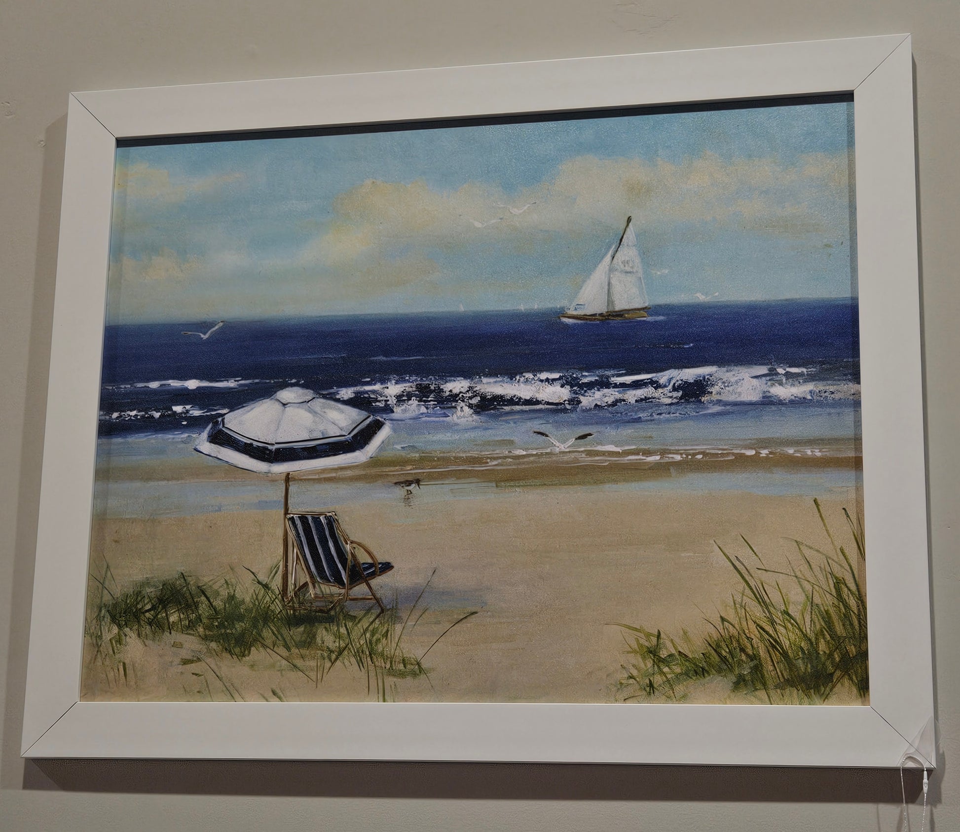Transform your home into a tranquil oasis with our Sand and Sailboats Wall Art. This stunning coastal painting features a serene scene of sand and sailboats gliding through  deep sea-colored waters, framed to perfection. Bring the soothing sights of the seaside into your living space.